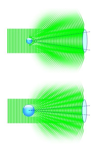 このとき、回折により進行方向が曲げられる角度は、粒子の径とほぼ比例
