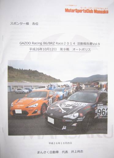 10/12(日)に大分県のオートポリスで開催された「GAZOO Racing 86/BRZ Race 2014 第9戦」の報告書をいただきましたので、紹介いたします。