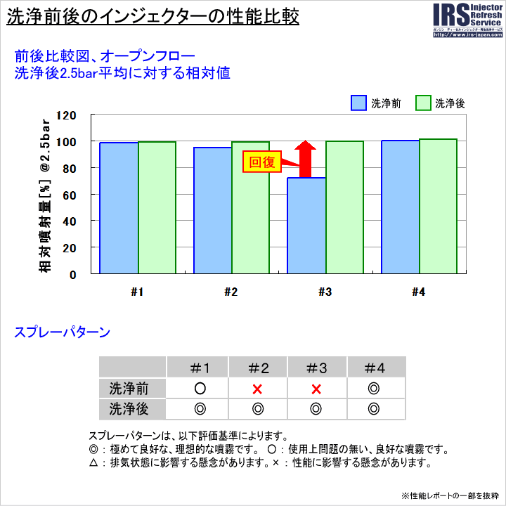 洗浄前に、このインジェクターの性能を測定したところ、添付の図のように、#2と#3に噴霧の異常が見られ、特に#3は正常に噴射しない状態でした。
