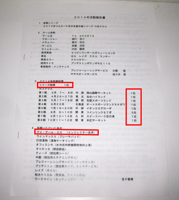 サポート選手である全日本ジムカーナ N3クラス シリーズチャンピオンの菱井選手から、今シーズンの活動報告書をいただきましたのでご紹介します。