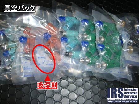 その理由は、弊社では洗浄後にインジェクターを真空パックしますので、お客様の手元に届いた後も、長期間インジェクターを最良の状態に保つことができるからです。かつ真空パックには吸湿剤を同梱しているため、真空パックで取りきれない微量な湿気による錆や動作不良の心配もありません。