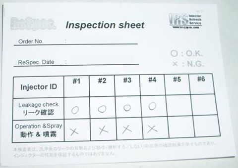 この「超音波洗浄のみ」は、基本的に過去に「超音波洗浄と性能測定」をご利用いただき、インジェクターに故障が無いことを確認されたお客様にお勧めしているもので、動作確認としては、噴射する/しない程度の簡易的なものになります。