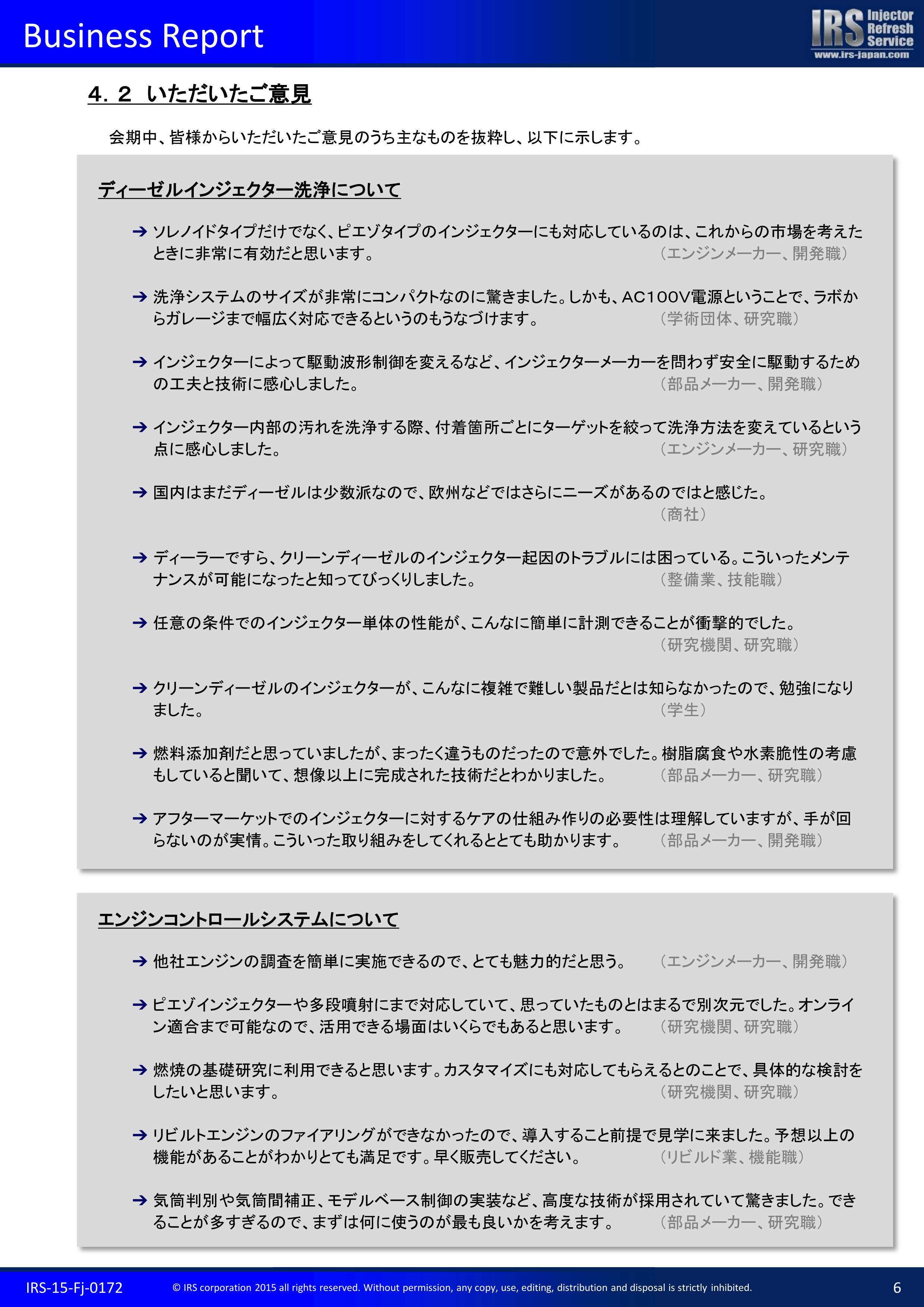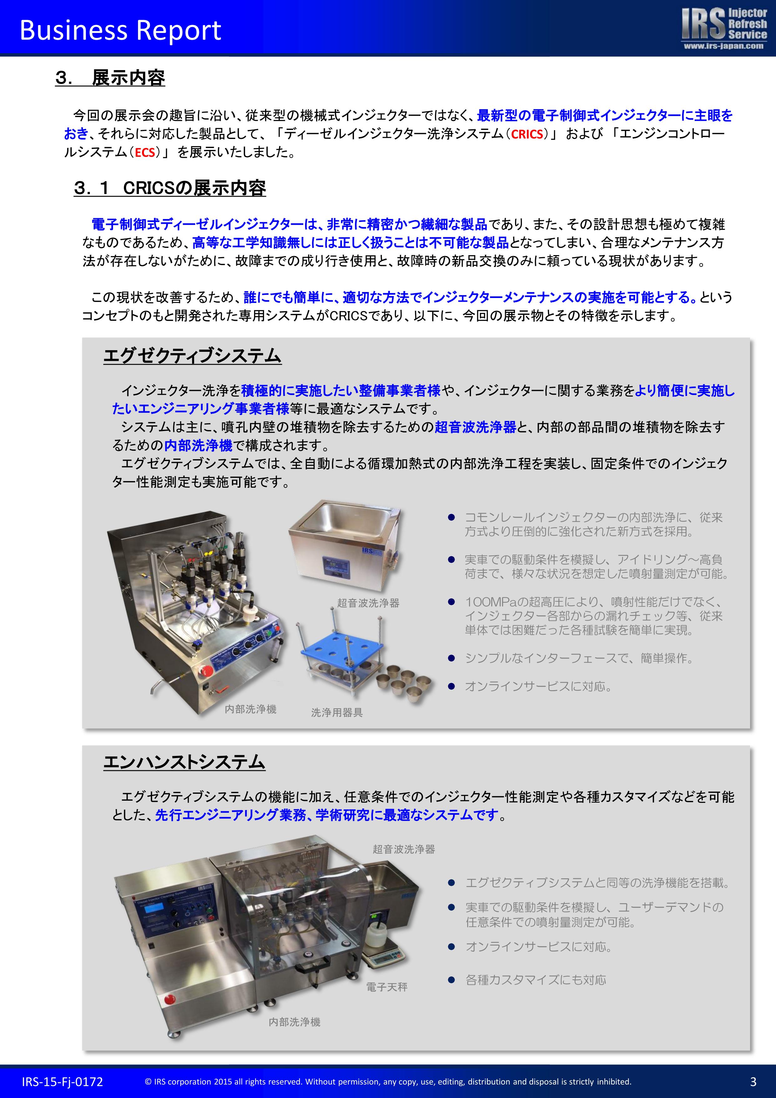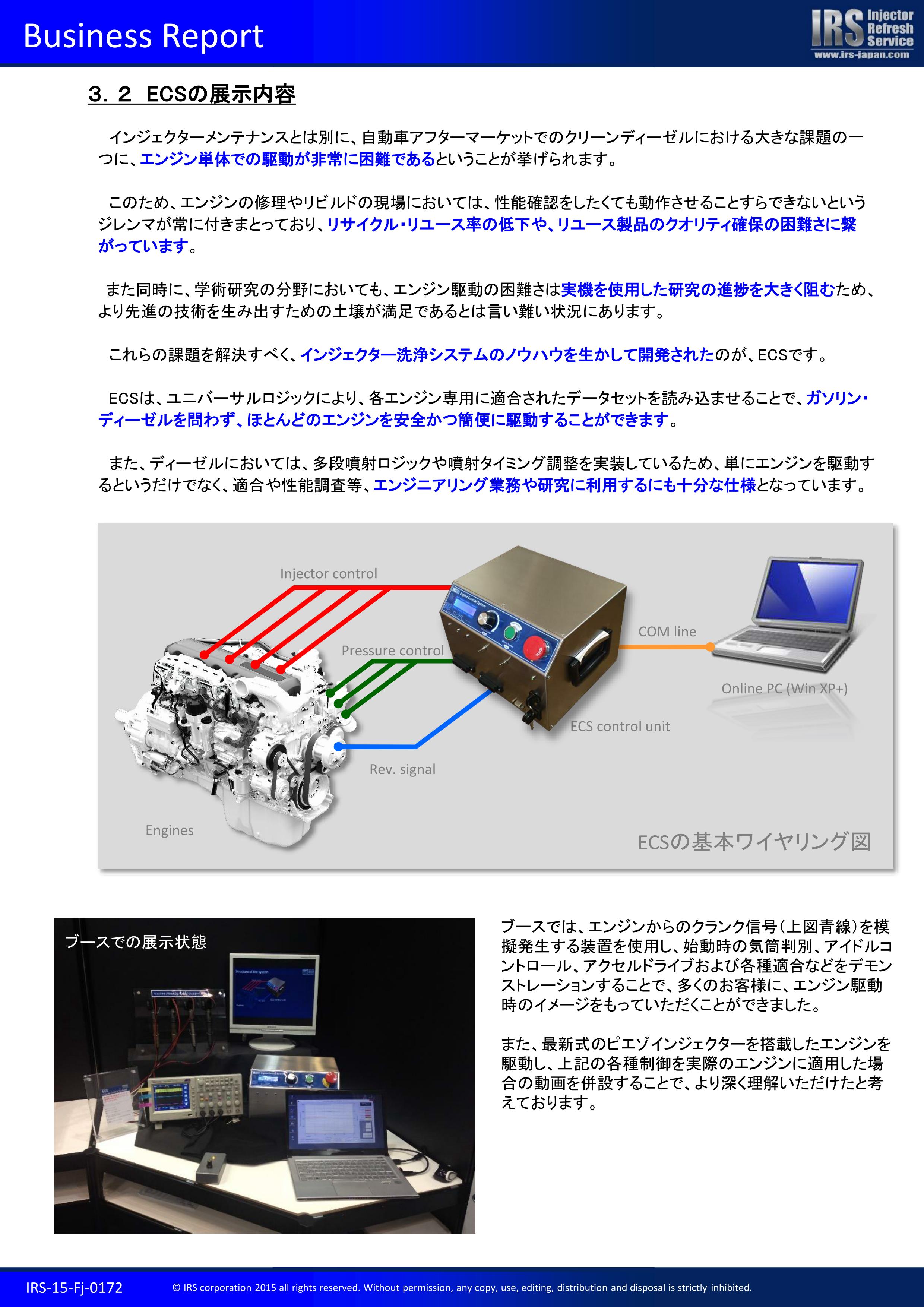 今回、自動車・部品メーカー様をはじめとする自動車業界の第一線でご活躍されている皆様に対し、アフターマーケットにおけるクリーンディーゼルのメンテナンスの課題と、その課題に対する弊社の取り組みを知っていただくことができ、とても実りのある展示会となりました。