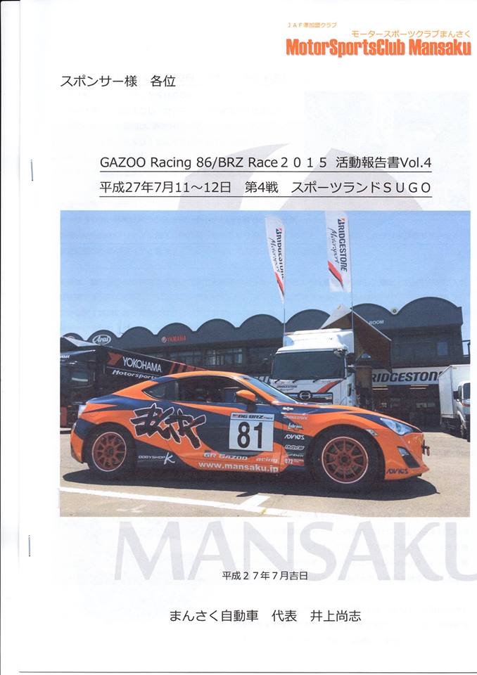 毎日の日課で、出社時に郵便ポストを確認するのですが、弊社がサポートをさせていただいている まんさく自動車様から、GAZOO Racing 86/BRZ Race 2015の報告書が届いていました。