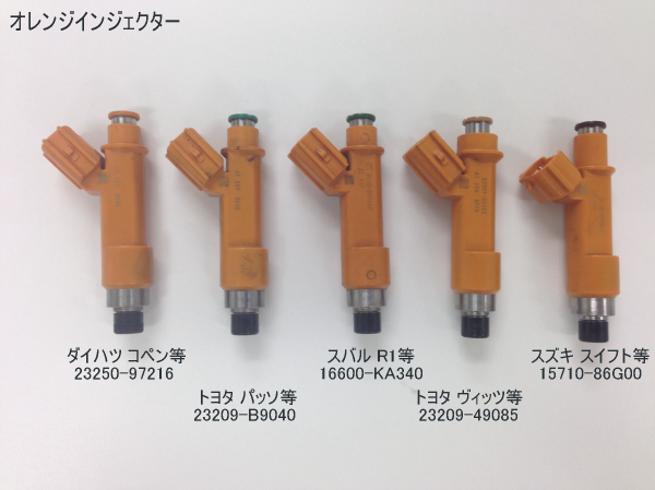 先日もそうだったのですが、弊社ではインジェクターの在庫整理で、いつもオレンジ色のインジェクターの選別に大変苦労します。その理由は、オレンジ色のインジェクターには、形がほぼ同じものが5種類もあるためです。昨日は時間があったため、写真に撮って整理してみました。