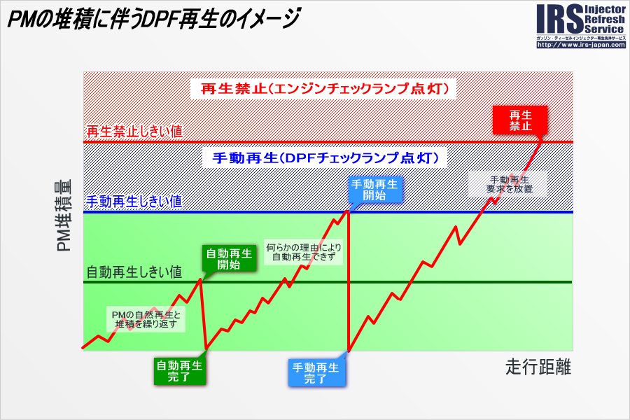 PMが異常に堆積した状態でDPFの再生をおこなうと、PMが異常燃焼をおこし、DPFの破損に至る可能性が高くなります。そのため、この状態になってしまうと、エンジンコンピューターはDPFの再生を禁止します。かつ、走行中に自然再生が起きないように、走行の制限もかかります。