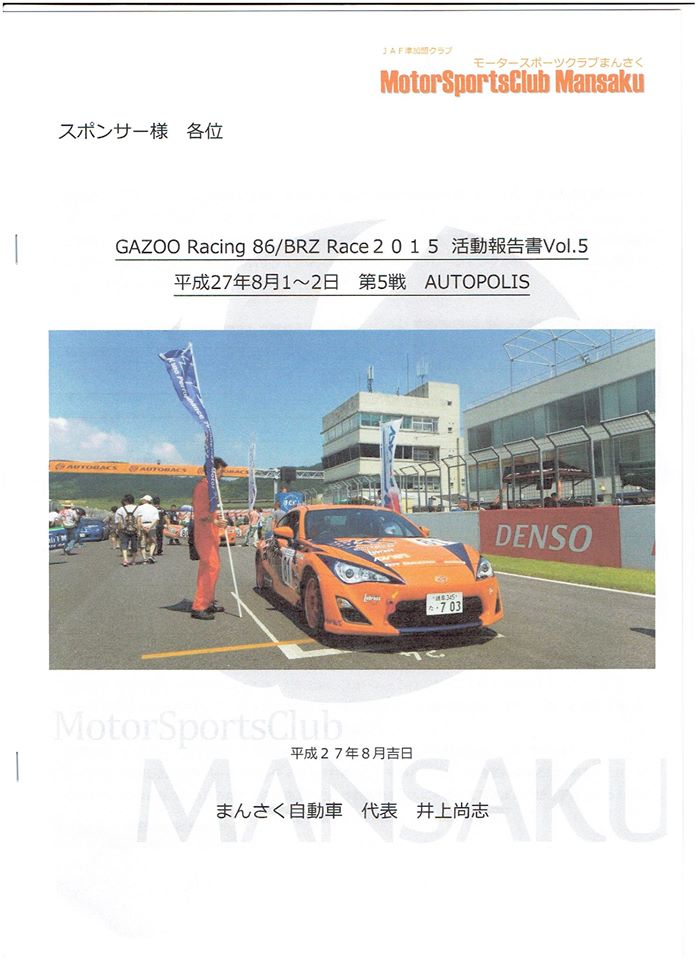 さて、本日は、弊社がサポートをさせていただいている まんさく自動車様から、8/2(日)に大分県のAUTOPOLISで開催された「GAZOO Racing 86/BRZ Race 2015 第5戦」の報告書をいただきましたので、紹介いたします。