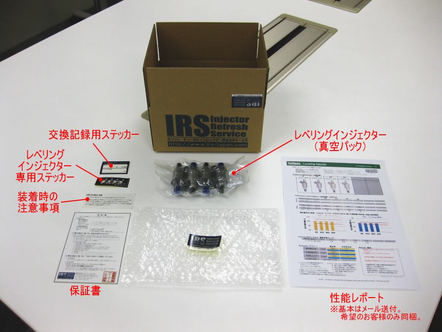 今回、弊社で販売中のレベリングインジェクターを例にとり掲載しましたが、弊社ではインジェクターと性能レポート(同梱希望の方のみ)の他に、「保証書」「装着の際の注意事項」「レベリングインジェクター専用ステッカー」「交換記録用ステッカー」を同梱しています。