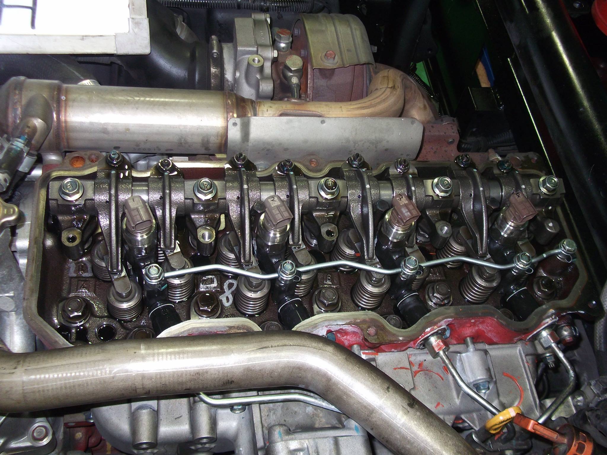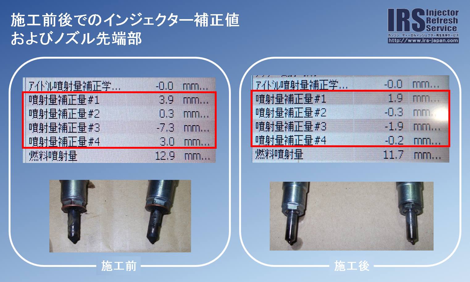 インジェクター洗浄施工後、性能結果が良好であったことから、インジェクターをエンジンに搭載し、最終確認として車両診断機にて、インジェクター補正値を確認しました。