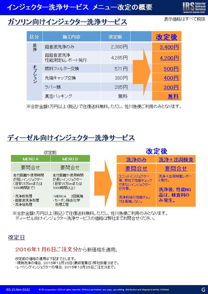 弊社が提供しているガソリン・ディーゼル向けインジェクター洗浄サービスにつきまして、その品質をさらに向上させるべく洗浄工程を見直した結果、この度、メニュー改定をおこなう運びとなりましたので、下記にてご案内申し上げます。