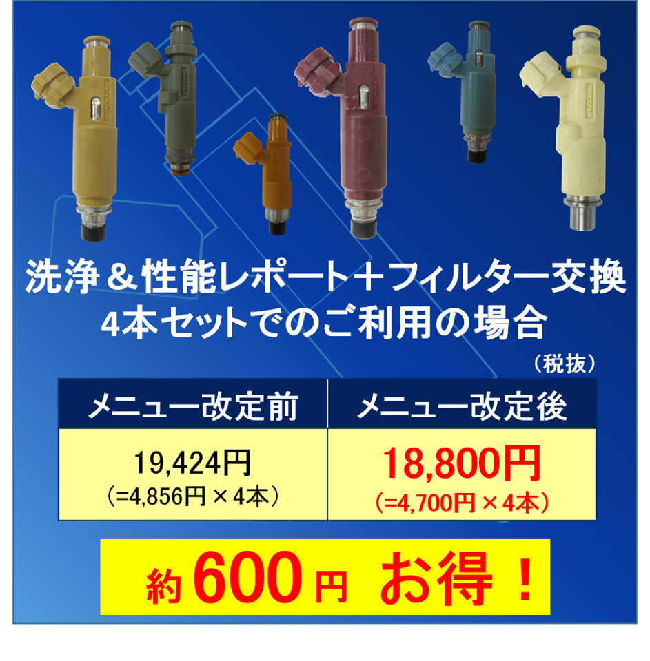 ガソリン向けでは、今主流の樹脂タイプのインジェクターにおいて、ご利用頻度が最も高いメニューの組合せである『洗浄&性能レポート+燃料フィルター交換』の価格を、改定前と比較して安く設定しております。4気筒であれば、合計で600円程度安くなります。