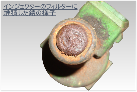 燃料ラインに錆等の異物があると、せっかくインジェクターを洗浄したとしても、その異物によりインジェクターが動作不良を起こしてしまう可能性があるため、お客様には、この状況を説明し、燃料ラインの確認をお願いしました。