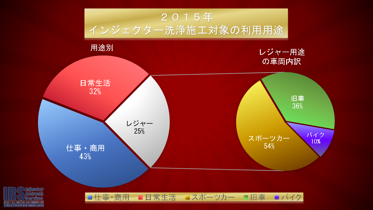 本日は、2015年(2015年1月~12月)の期間に、弊社にてインジェクター洗浄を施工いただきました車両について、利用用途および車両タイプ別の比率をまとめましたので、ご紹介いたします。