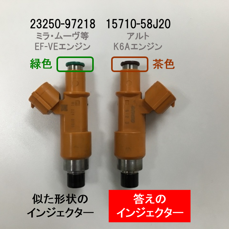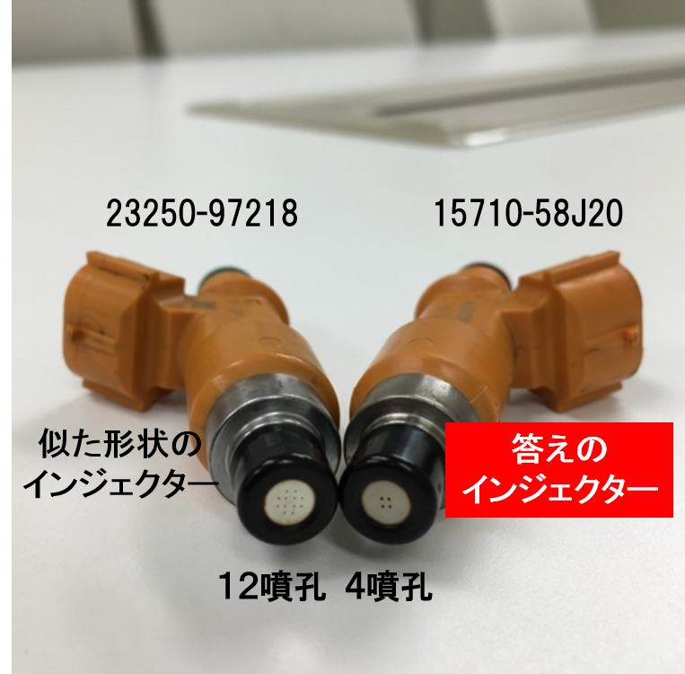 実は、答えと似た形状のインジェクターが、1種類含まれていました。その形状の違いは、燃料入口側の色と噴孔数のみ。噴孔数はクイズの写真では分からないため、燃料入口側の色の僅かな違いで見分ける必要がありました。