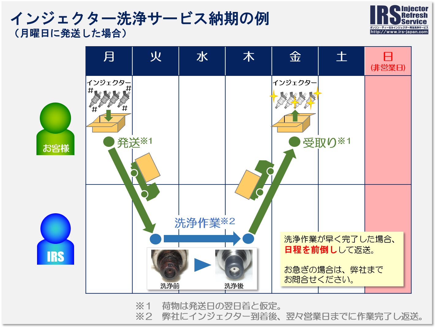 添付の画像にその一例を掲載しましたが、例えば、月曜日にご発送いただいた場合、遠方でなければ、インジェクターは金曜日にお手元に戻ってくることになります。