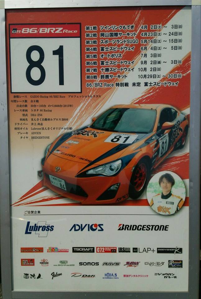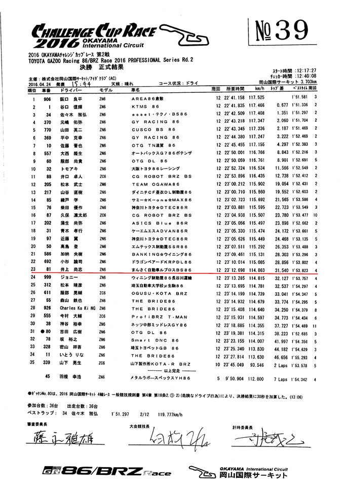 サポートのまんさく自動車 井上選手から、4/23(土)、24(日)に岡山サーキットで開催された「GAZOO Racing 86/BRZ Race 2016 第2戦」の報告書をいただきましたので、紹介いたします。