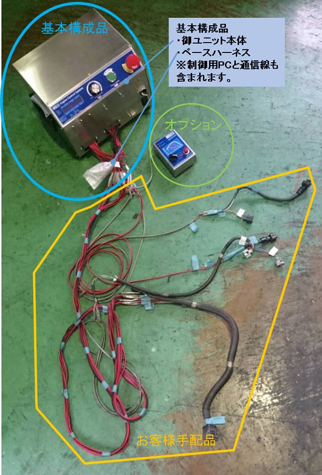 例えば、ECSのベースハーネスからエンジンへの接続に必要な、エンジン用ハーネスやカプラなどは、お客様に手配いただいています。もちろん、事前に要求仕様をご連絡いただければ、弊社で基本構成品以外の手配をおこなうことも可能です。