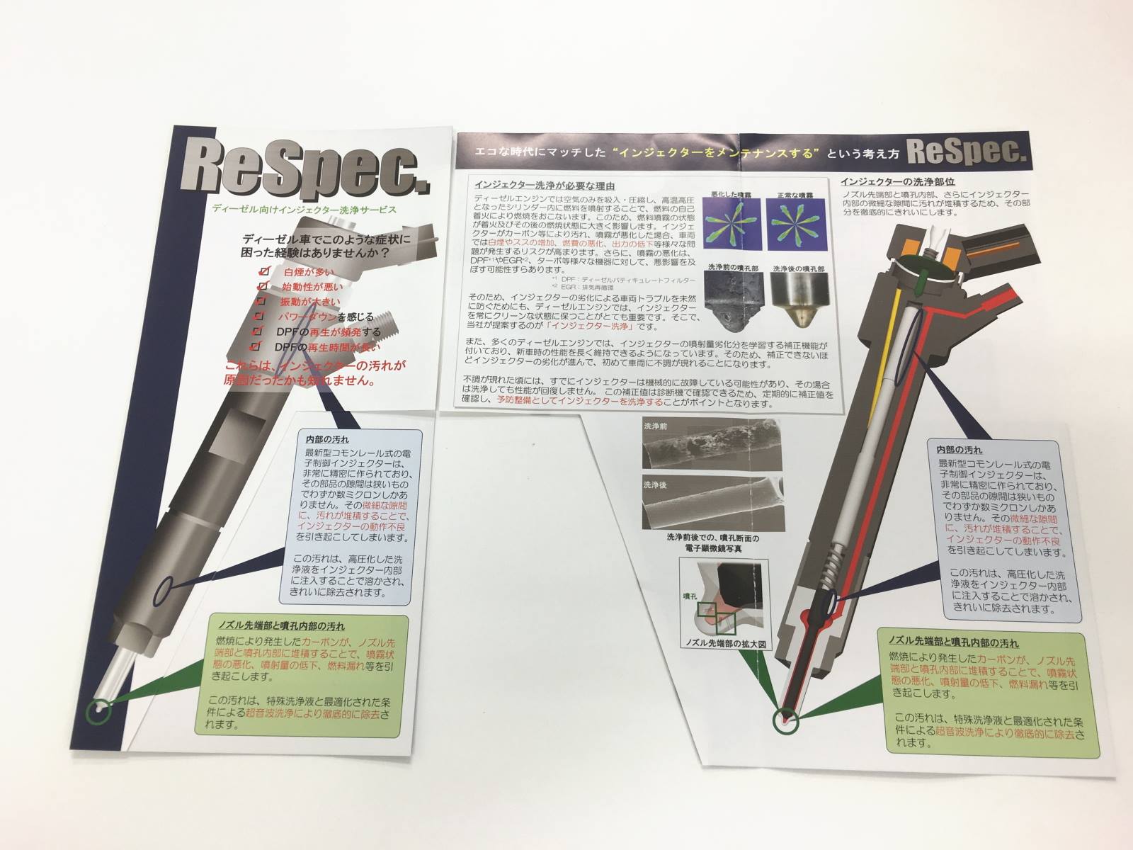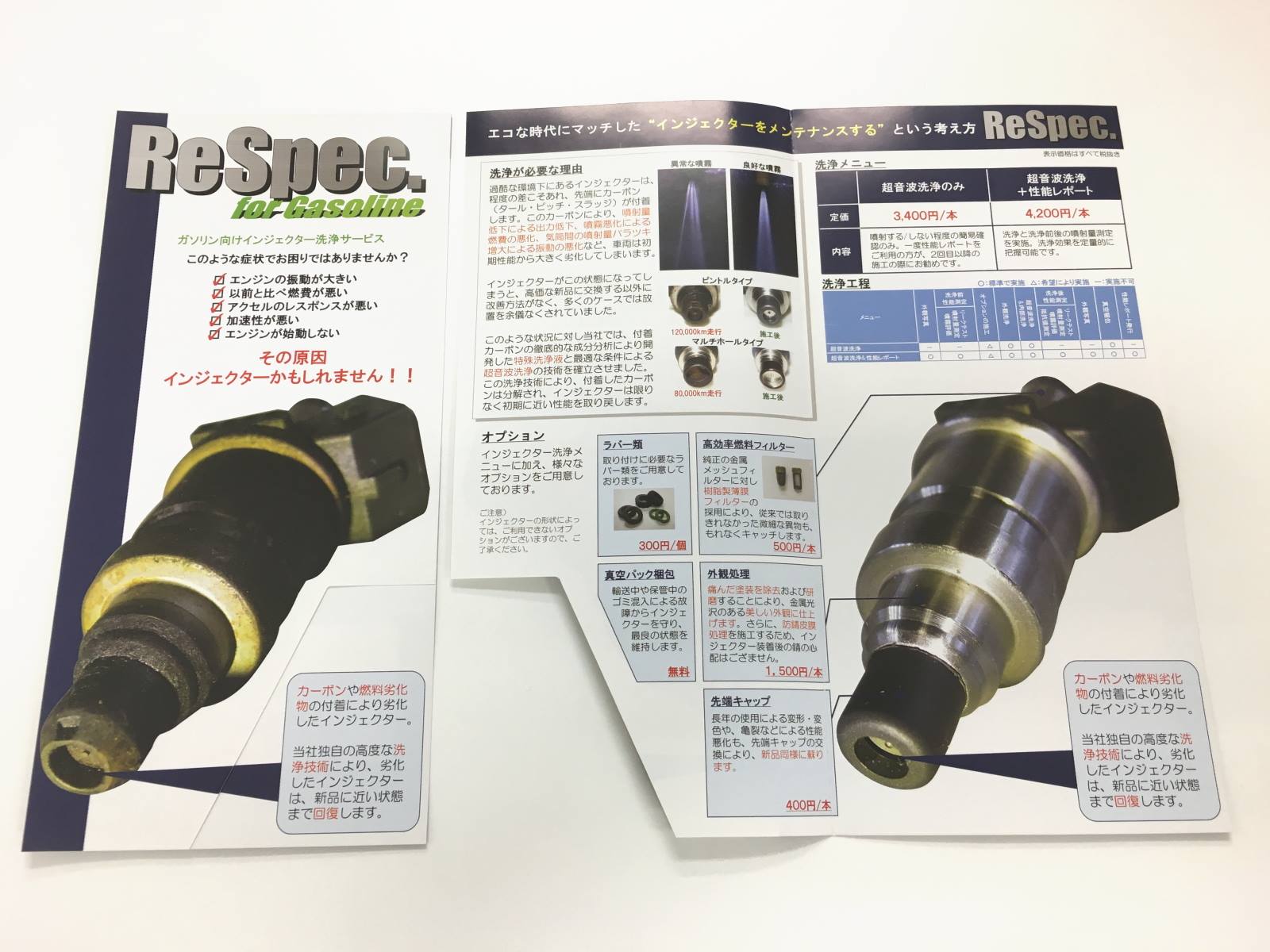 表紙は施工前の汚れたインジェクター、開くと施工後のピカピカのインジェクターが登場するインパクト大のパンフレットです。こちらでは、洗浄が必要な理由や施工メニュー・オプション等を紹介しています。