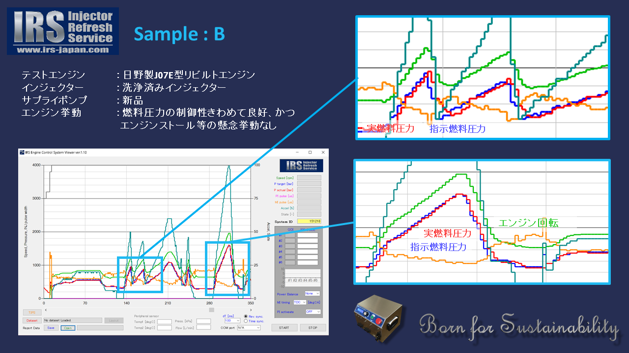 Sample Aの結果を踏まえて、サプライポンプを新品に交換していただいたエンジンが、Sample Bになります。エンジン駆動の結果を見ると、始動性が改善しており、アイドリング制御も良好になったことが確認できます。
