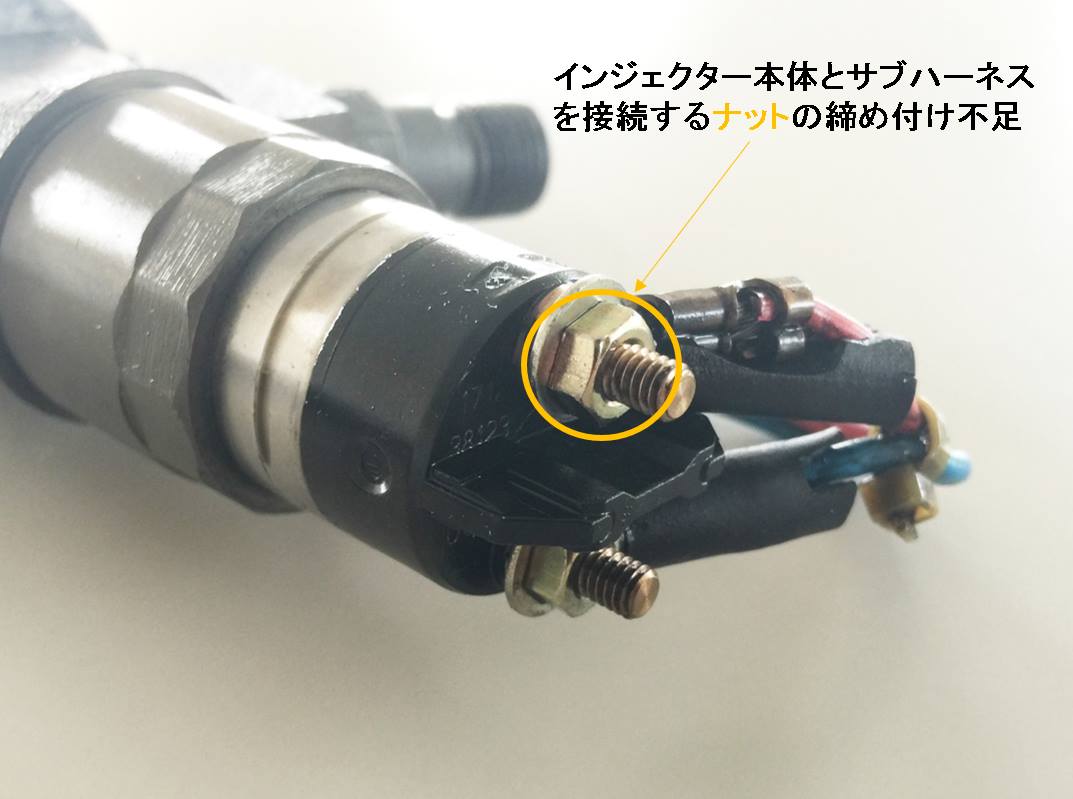 今回、この組み付け時にナット部の閉め付けトルクが不足してしまったため、走行中の振動により、ナットが緩みインジェクターの接触不良が起きてしまいました。