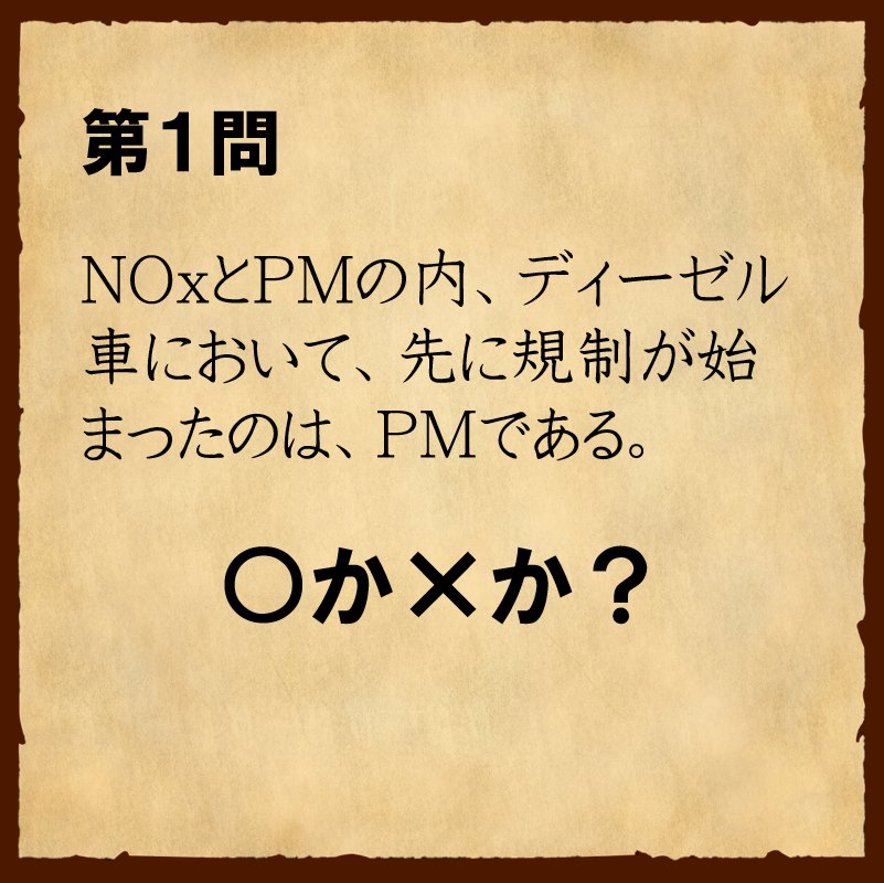ディーゼル車向けの排出ガス規制には、主にNOx(窒素酸化物)とPM(Particulate Matter:粒子状物質、いわゆるススのこと)の2つがあります。大気汚染が深刻化する中で、1990年代後半には、当時の石原東京都知事が、ペットボトルに入ったPMを振って見せるパフォーマンスが話題になりました。そこで問題です。