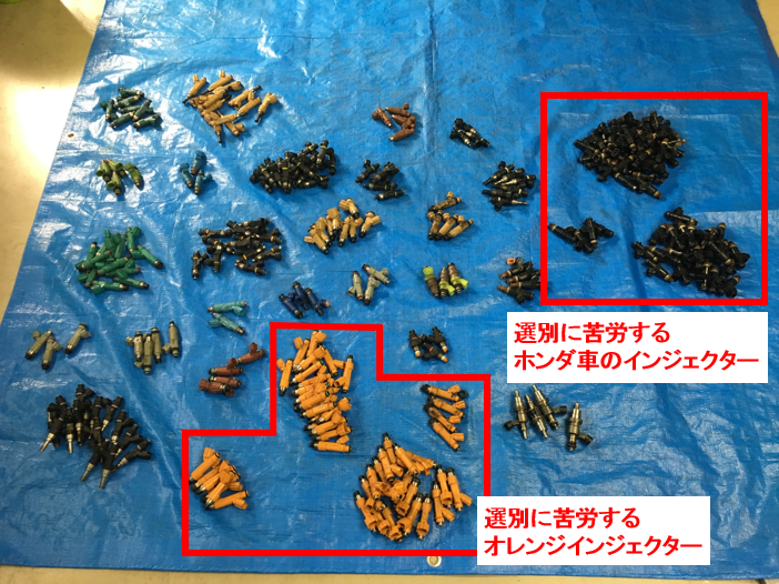 この在庫整理ですが、毎回オレンジ色のインジェクターとホンダ車のインジェクターの選別にとても苦労します。