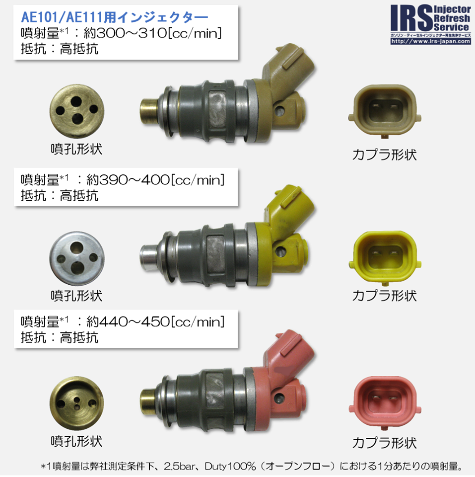 その多くはAE86のオーナー様なのですが、弊社では、添付の写真のように、AE101/AE111用インジェクタ―とほぼ同形状(噴孔形状違い)で、噴射量がさらに多いインジェクターもラインナップしております。