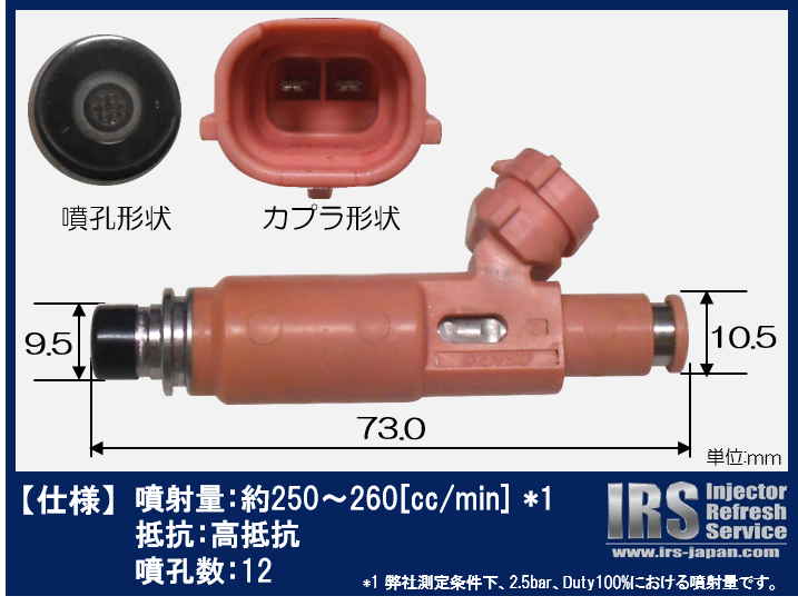 噴射量は、弊社測定条件下2.5bar/Duty100%において、およそ250から260[cc/min]の高抵抗タイプです。サイズに関しては、下記画像をご確認ください。