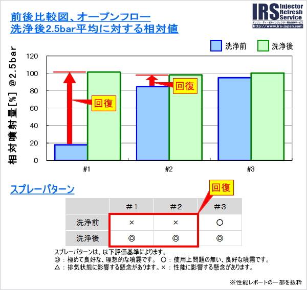 洗浄前のインジェクターの状態はひどく、3本中2本は正常に噴射しない状態でしたが、洗浄後はすべて良好に回復。これで今回の不調は、回復すると思われます。