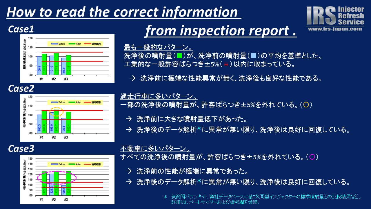 ここでも、Case2と同じく「洗浄前の噴射量低下が大きすぎた+洗浄前に極端な異常があった。」ということになるので、重要なのは範囲に入る・入らないではなく洗浄後の性能となるため、サマリー部や備考欄をご参照ください。