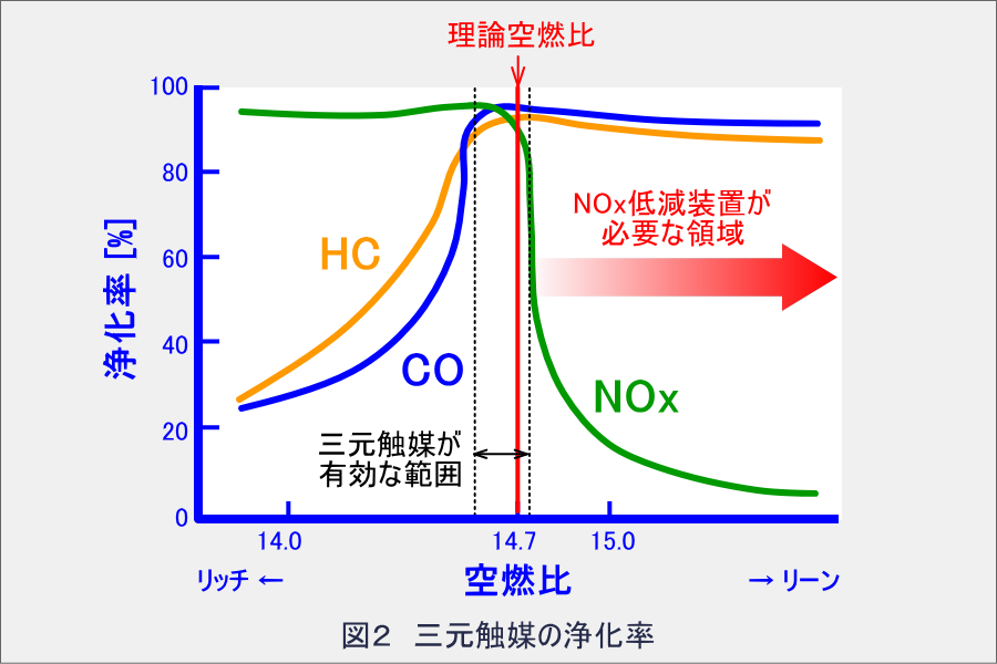 冒頭のデメリットでも紹介しましたが、図2に示すように、希薄燃焼では、空燃比が三元触媒の有効な範囲を超えてしまうため、三元触媒でNOxが低減できません。