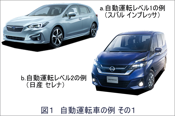例えば、自動ブレーキシステム。図1aのスバルインプレッサ等に搭載されているアイサイトが有名ですね。このシステムは、衝突の危険がある場合、ドライバーに注意を促した後、回避操作がなければブレーキ制御を自動でおこなうというものです。これは、先ほどの定義に照らし合わせると、レベル1に相当することが分かります。
