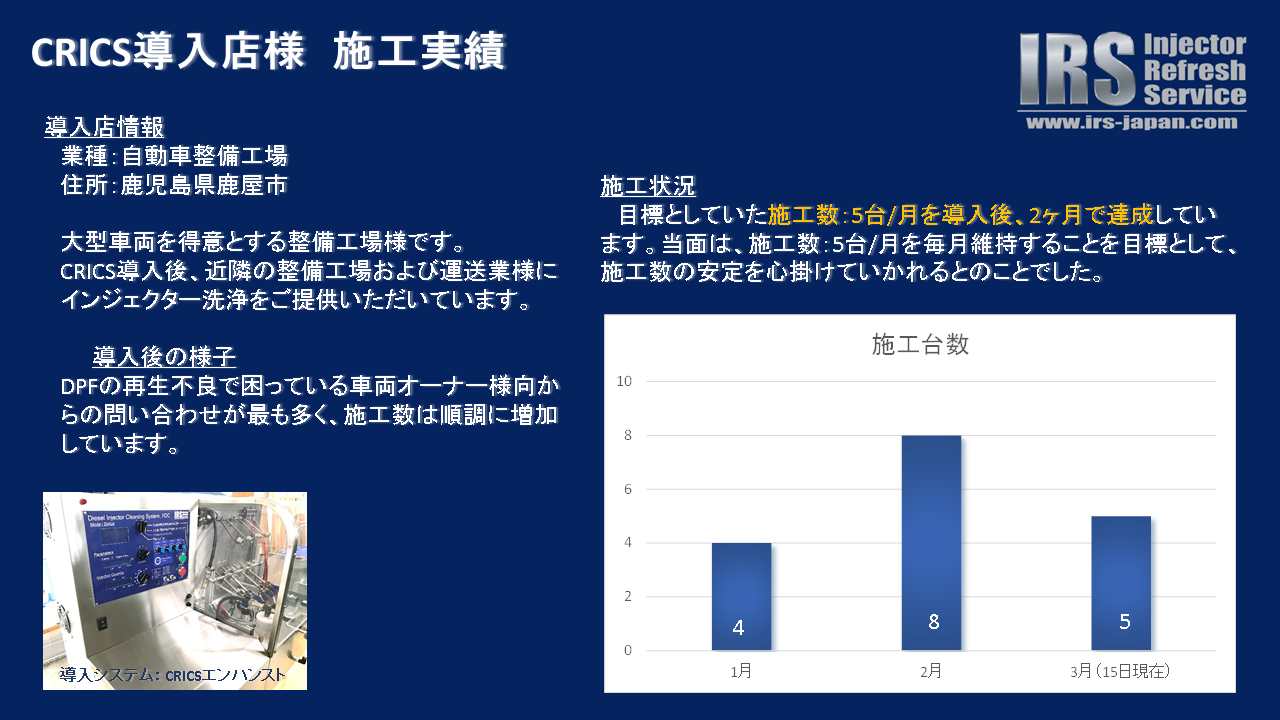 事前に近隣の同業者および運送業者様へ、インジェクター洗浄をご紹介いただいていたこともあり、CRICSの導入直後から安定した施工数となっています。