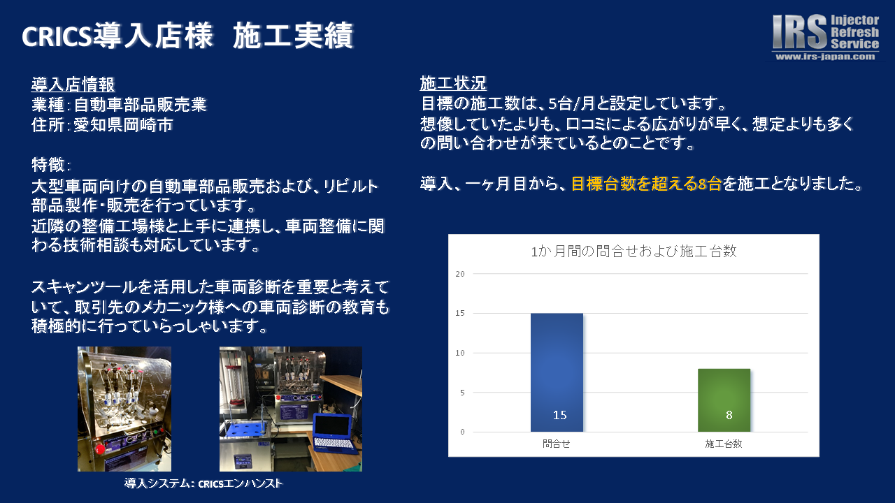 半年間ほど、インジェクター洗浄サービスをご利用いただいた後、CRICS導入となっています。