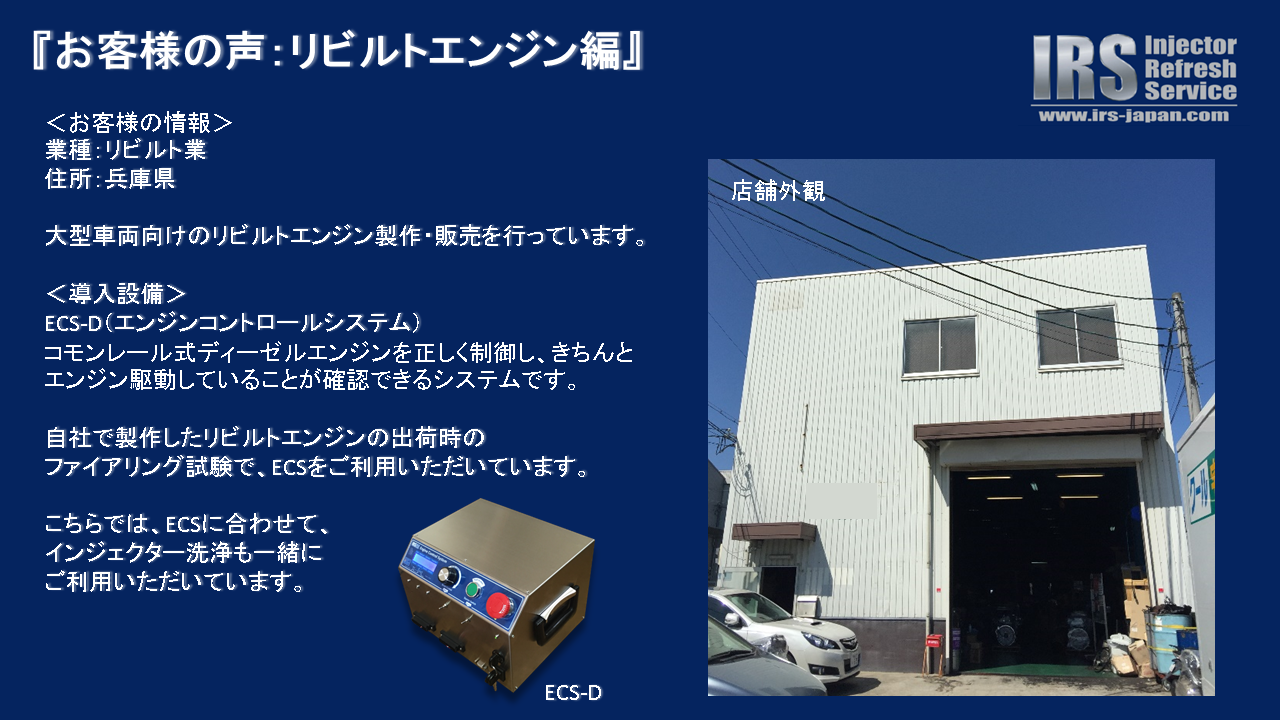 自社で製作したリビルトエンジンのファイアリング試験で、ご利用いただいています。こちらでは、ECSに加えて、リビルトエンジン向けに、インジェクター洗浄もご利用いただいています。