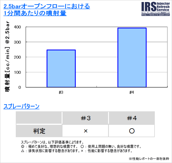#3 のインジェクターについて、噴射量異常と噴霧異常、さらに先端リークも見られました。参考として測定した#4は特に問題ありませんでした。