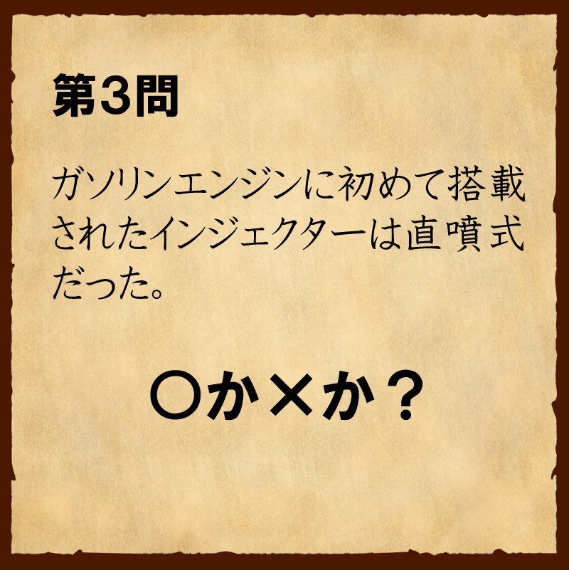夏休み特別編 『インジェクタークイズ IRSオリジナルグッズプレゼント!!』 第3問です。 今では、ポート噴射式だけではなく、直噴式のインジェクターも多く採用されているガソリンエンジン。ガソリンエンジンでインジェクターが初めて採用されたのは車ではなく戦闘機でした。そこで問題です。 【問題】 『ガソリンエンジンに初めて搭載されたインジェクターは直噴式だった。〇か×か?』