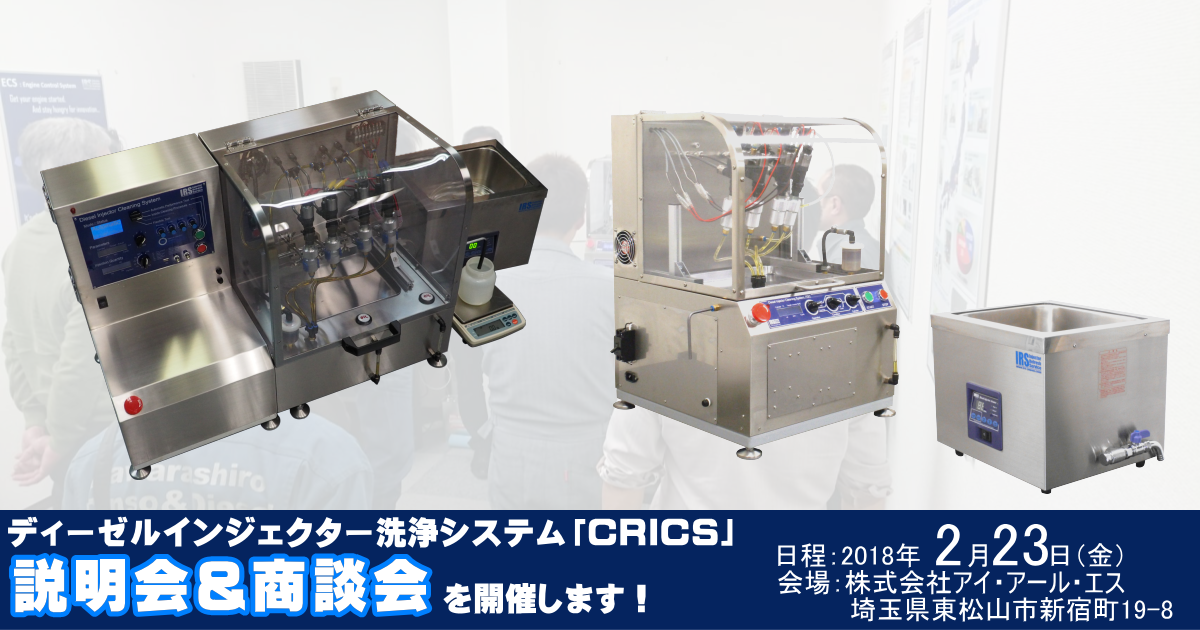 弊社製品であるディーゼルインジェクター洗浄システム『CRICS』について、下記の日程にて製品説明会並びに商談会を開催いたします。