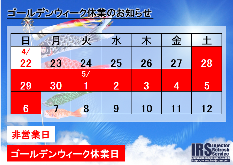 いつも、アイ・アール・エスをご利用いただき誠にありがとうございます。ゴールデンウィーク期間の休業についてお知らせをいたします。