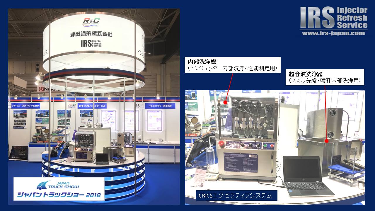 今回の出展は、弊社製品であるCRICS(ディーゼルインジェクター洗浄システム)や、ECS(エンジンコントロールシステム)をご利用いただいている企業様(津田鋼業様、リトラスセラメックス様、リトラス様)との共同出展となっています。