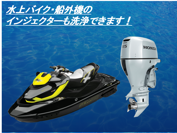 水上オートバイや船外機のインジェクターは、クルマと同形状のものが大半なので、問題なく洗浄と性能測定が可能です。