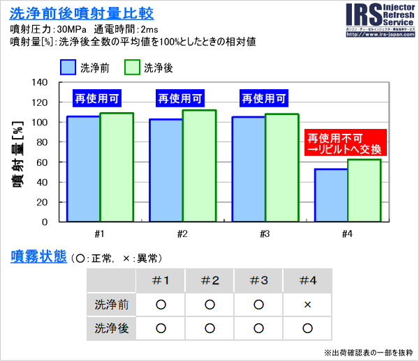 今回の結果から、×の1本は洗浄前からすでに機械的に故障していた可能性が高く、出荷基準を満たした3本は再使用し、×の1本はリビルトへの交換となりました。