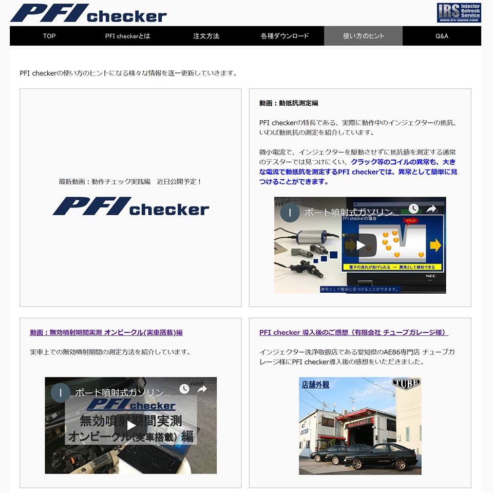 いくつかのコンテンツを更新していますが、特に『動抵抗測定編』や『無効噴射期間実測 オンビークル(実車搭載)編』がお勧めです。これらは、実際にPFI checkerを用いて、動抵抗や無効噴射期間を測定していますので、使う際の具体的なイメージがわきやすいと思います。