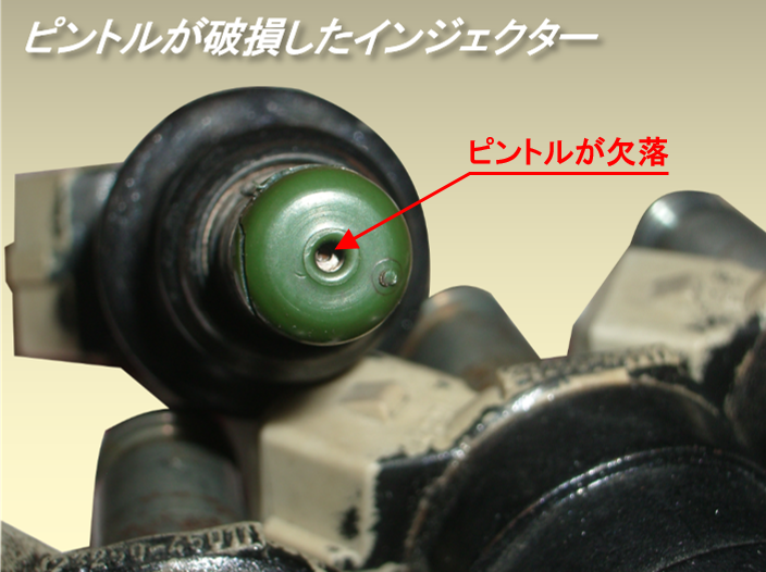 写真のインジェクターは、一見問題無いように見えますが、よく見ると、ピントル部分が破損しています。